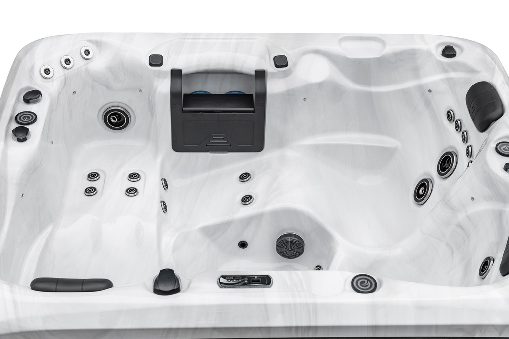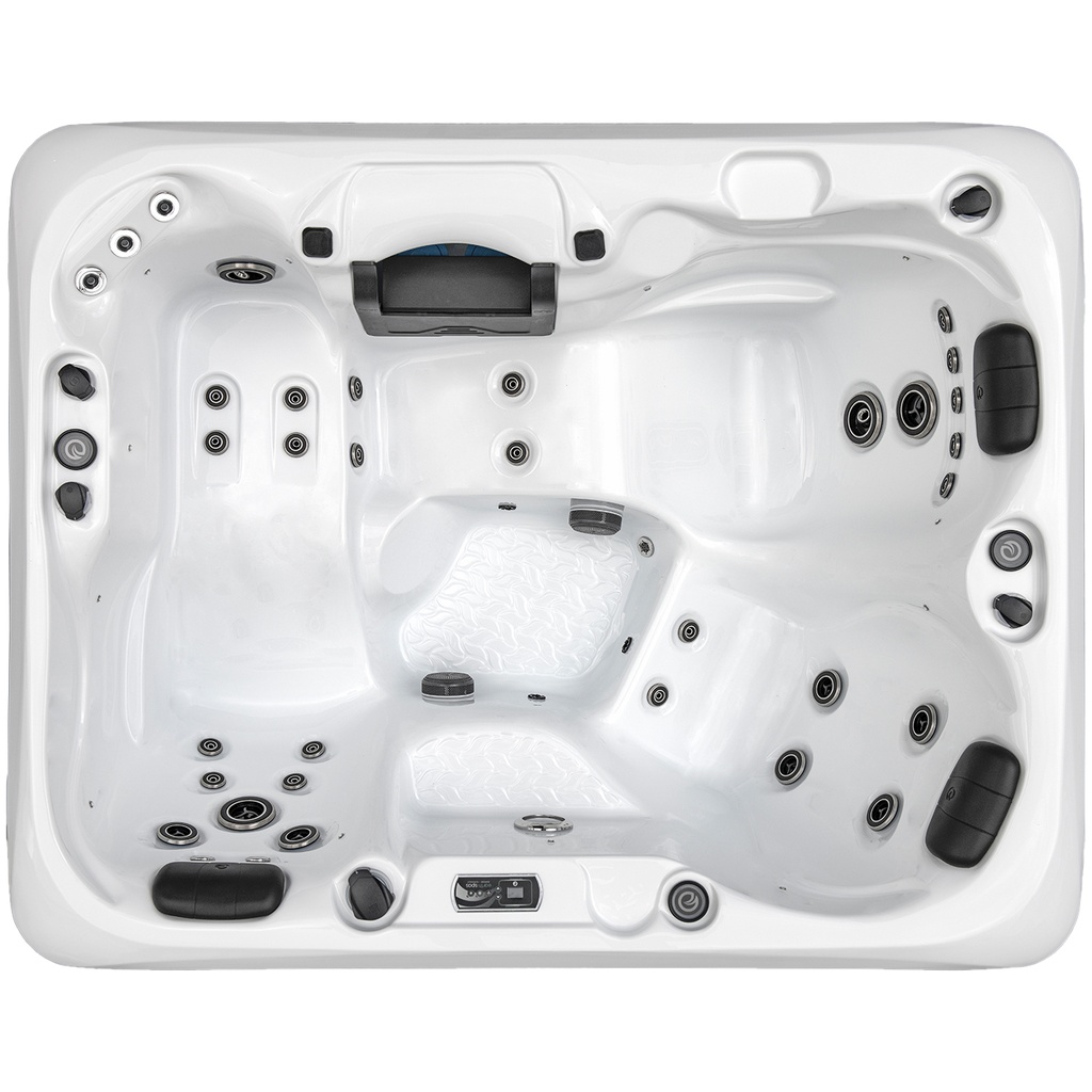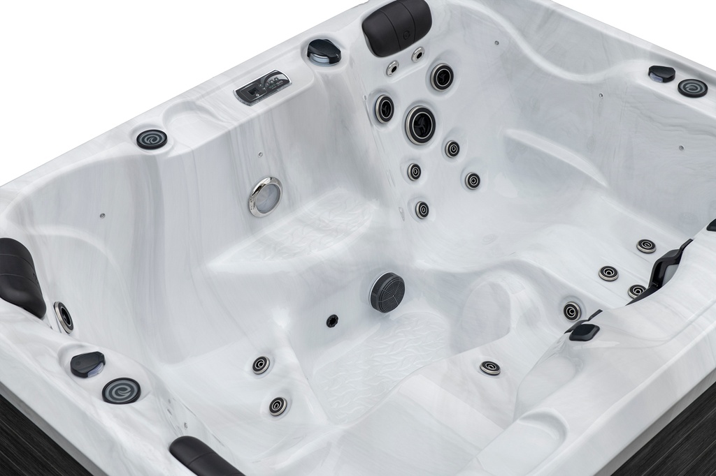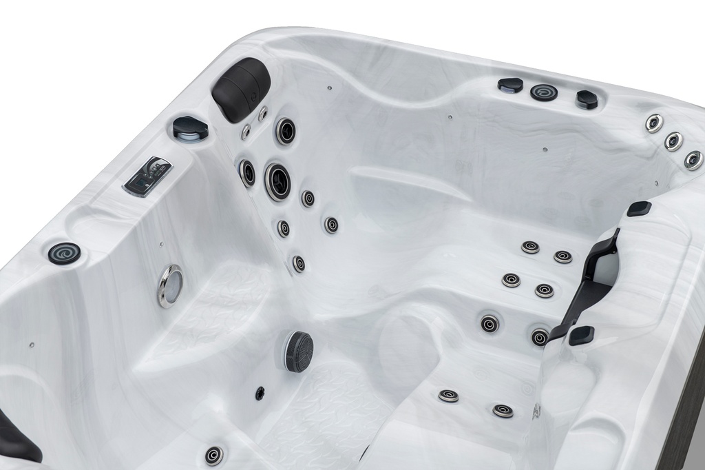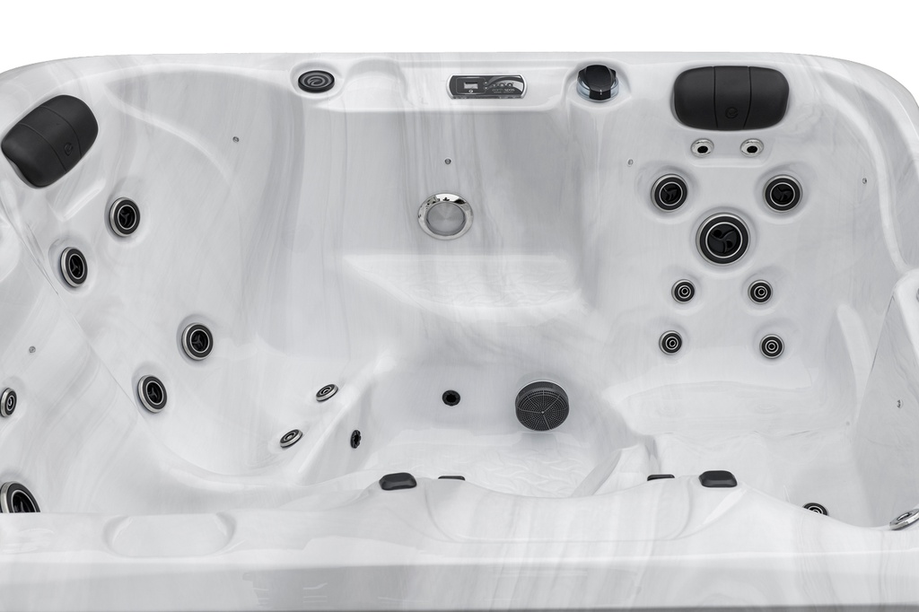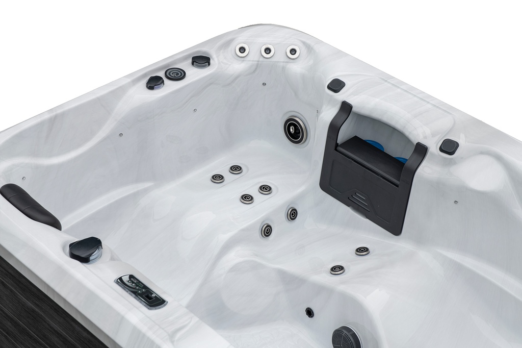 Unique, compact design with two lounger positions. One regular size larger lounge and one smaller lounge is ideal for the shorter user between 150cm to 175cm. Ideal for tight spaces and for those looking for something a little easier to maintain. Extensive interior LED lighting pack plus exterior corner lighting strips. Bluetooth audio and subwoofer comes as standard. Colour matching spa side step and branded Earth Spas spa cover included.